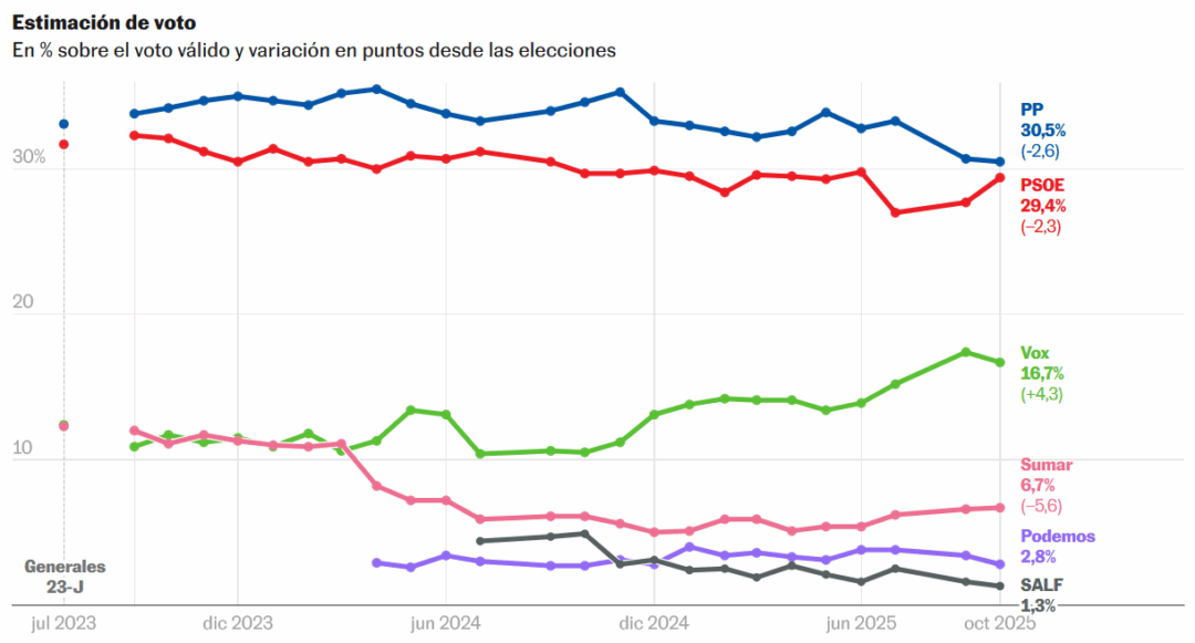 El PSOE sube casi dos puntos en estimación de voto en un mes y se sitúa a la menor distancia del PP desde las elecciones de 2023 Fecha de la entrada 6 octubre, 2025