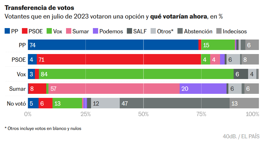 El estudio de 40dB. muestra que Vox sigue teniendo al votante más fiel —el 84,2% de sus apoyos de 2023 repetirían hoy—, seguido por el PP (73,9%) y el PSOE (71%). Si las generales se celebrasen ahora, los populares cederían al partido de Santiago Abascal un 14,5% de sus votos de las últimas generales, frente al 3,2% que entonces apoyó a Vox y ahora se decantaría por Feijóo. La formación de extrema derecha aumenta, a su vez, las fugas a la marca del agitador ultra Alvise Pérez (6,2% frente al 4,6% del mes anterior). Los socialistas son los que acumulan más indecisos (7,6%), aunque los reducen respecto al último barómetro (8,8%). Sumar retendría al 56,6% de sus votantes de 2023, al reducir notablemente las fugas de votos a Podemos en un mes (del 26,2% al 20,3%), si bien aumentan las transferencias al PSOE (del 6,5% al 7,7%).
