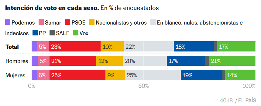 Vox obtiene 7,1 puntos más en intención de voto en el electorado masculino (20,7%) que en el femenino (13,6%). En el espacio a la izquierda del PSOE, Sumar se impone sobre Podemos tanto entre las mujeres como entre los hombres.