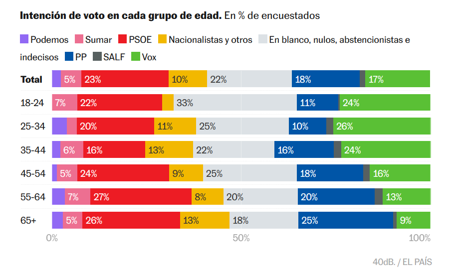 Por edades, Vox, con un 24%, sigue siendo el primer partido en intención de voto en la franja de los 18 a los 24 años, con 1,6 puntos de ventaja sobre el segundo, el PSOE (22,4%), y hasta 13 sobe el tercero, el PP (10,9%). El partido de extrema derecha también se impone en las horquillas de 25 a 34 años (25,9%) y de 35 a 44 (23,8%). La formación liderada por Santiago Abascal obtiene su peor dato en las franjas de 55 a 64 y mayores de 65 años (12,7% y 8,9%, respectivamente), donde el PP obtiene las mayores ventajas sobre su competidor directo. Vox se impone a la suma de la plataforma de Yolanda Díaz y Podemos en todas las edades.